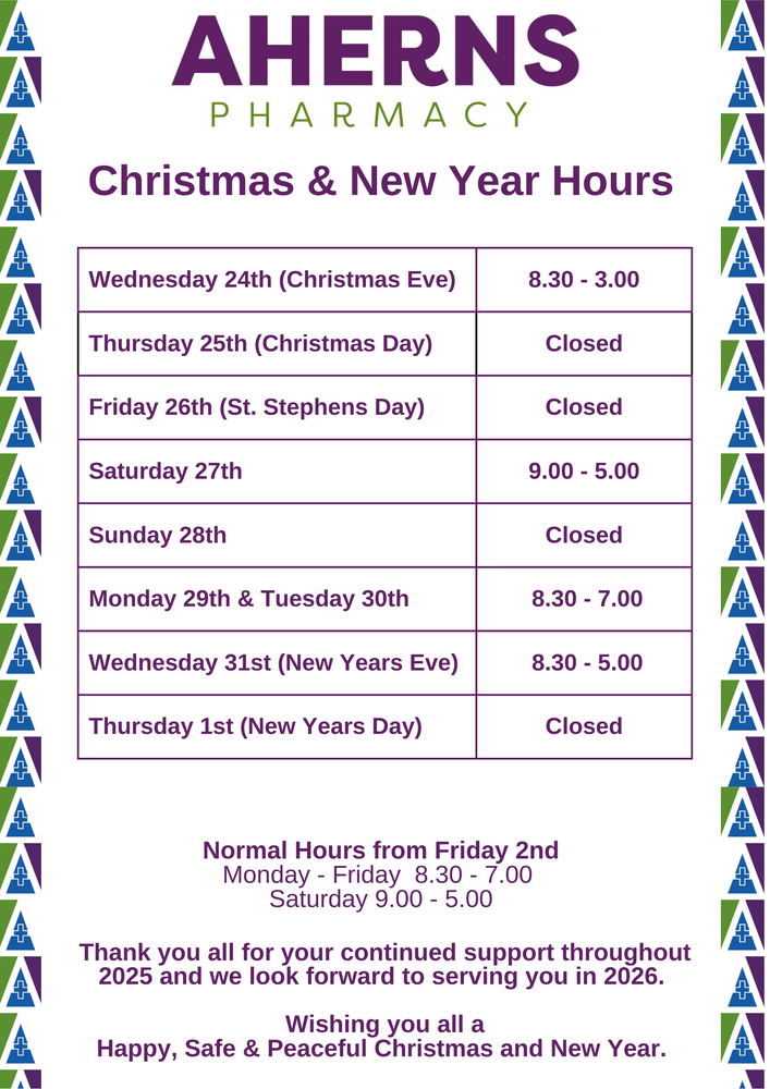 To arrange an appointment please email ahernspharmacybooking@gmail.com for consent form and information pack.